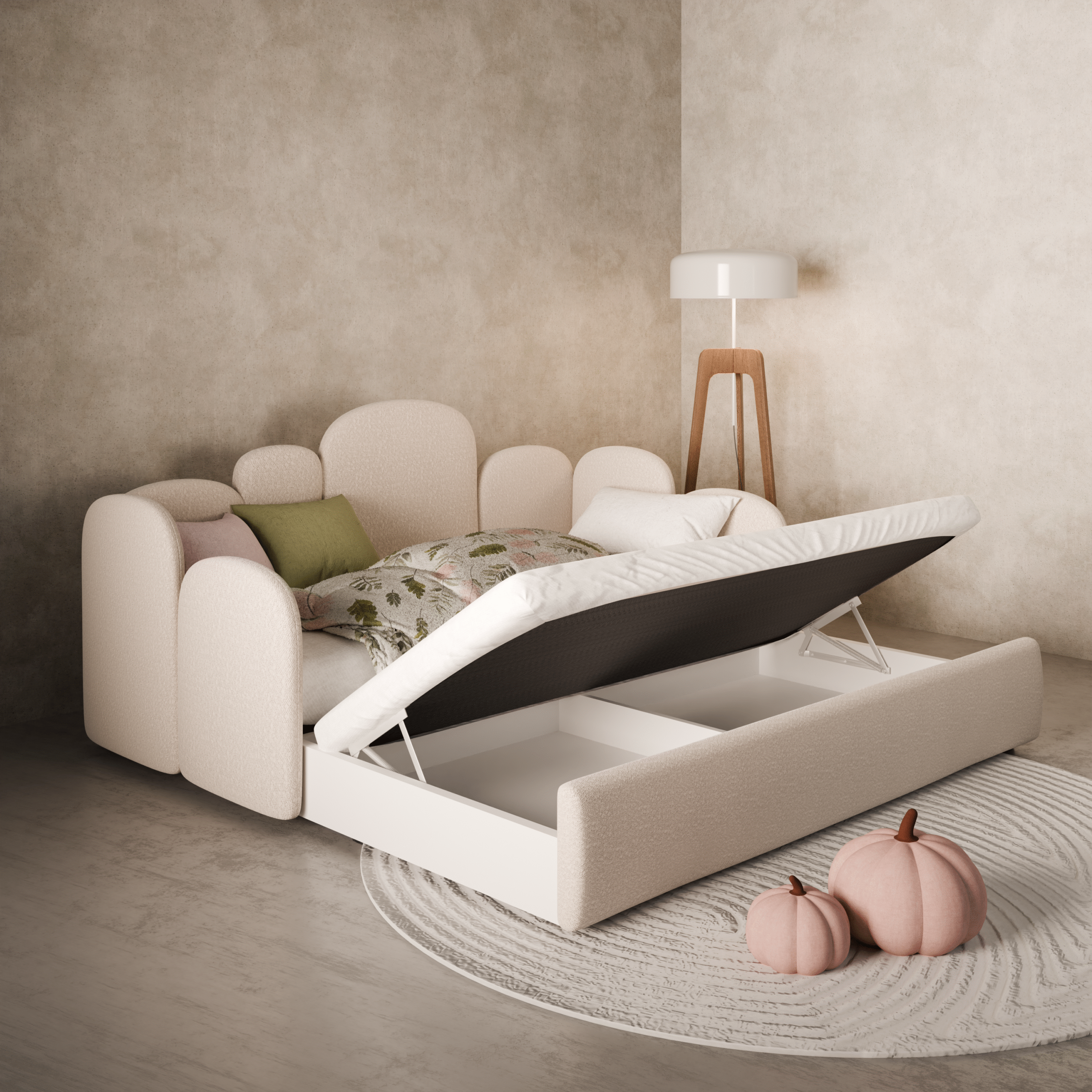 Szuflada zawiera wbudowany twardy materac piankowy, dzięki czemu jest gotowa do użytku od razu po rozpakowaniu. Jeśli do łóżka dodasz barierkę – wysuwa się ona razem z szufladą, zapewniając wygodne i bezpieczne użytkowanie.